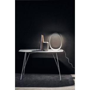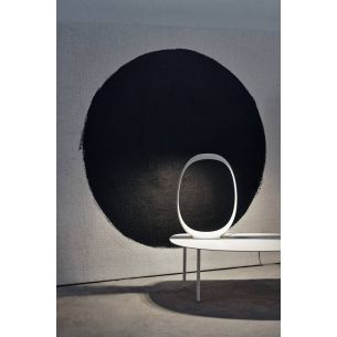 Tel un cadre enveloppant circonscrivant le vide pour se remplir de lumière, la lampe de table Anisha est un objet de design qui surprend par son caractère essentiel.