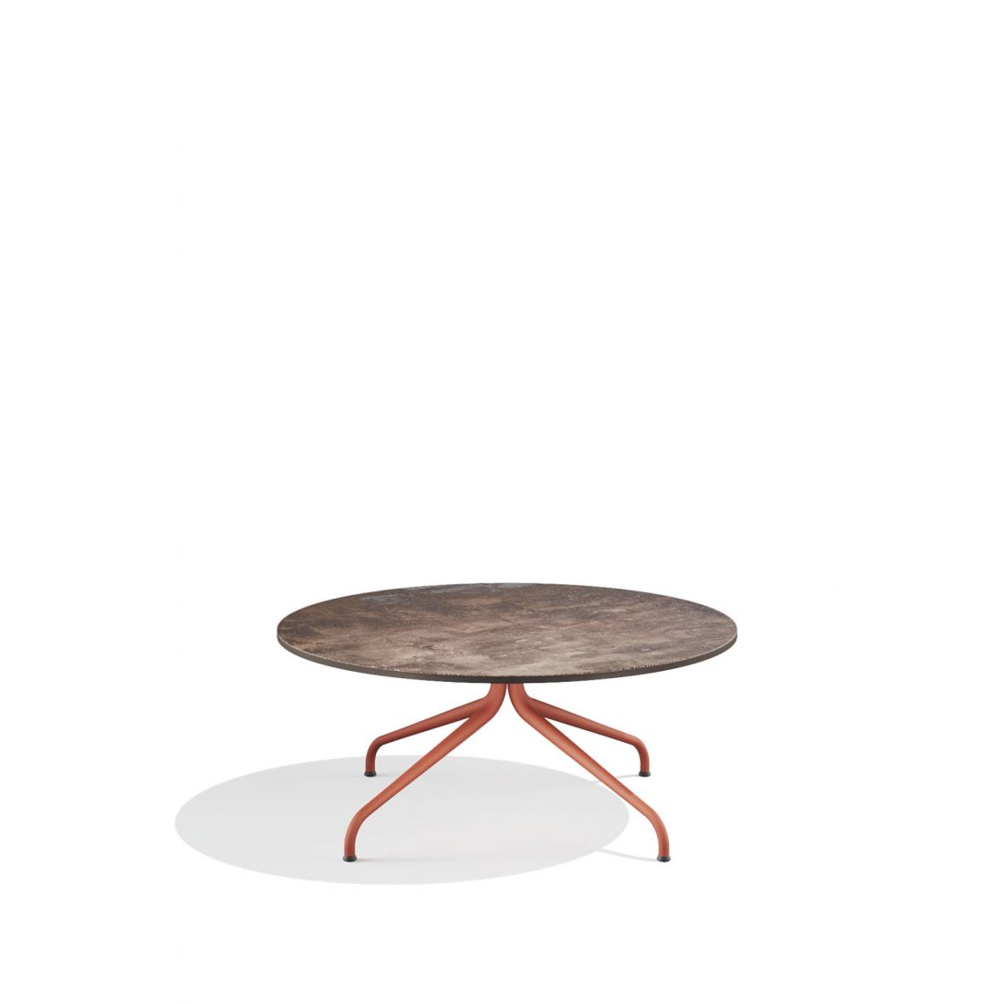 Table basse ronde ⌀70 avec structure en acier et plateau en acier ou HPL (High Pressure Laminate). Les lignes fluides et épurées de la jambe à quatre branches lui confèrent une expression vivante mais très élégante.