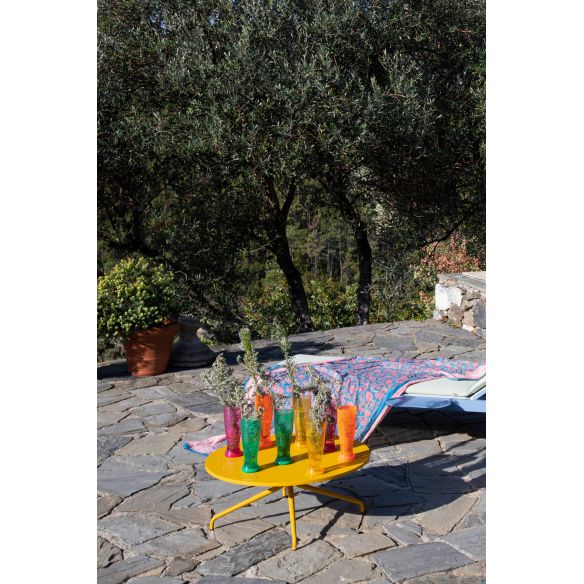 Les structures en acier de toutes les pièces de la famille Kissi sont protégées à l’aide d’un traitement anti-corrosion avec une couche de primer (ou galvanisation à la demande) et sont peintes à la poudre polyester très résistante aux conditions atmosphériques. Les plateaux des tables existent en métal, HPL (High Pressure Laminate) de différentes couleurs et Iroko.