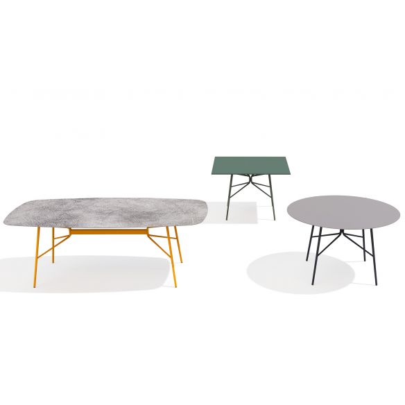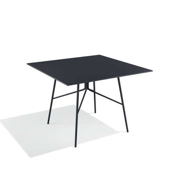 Table carrée 120x120cm avec structure en acier et plateau en acier ou HPL (High Pressure Laminate). Elle possède une structure complexe mais dégage une impression visuelle de légèreté et d’une extraordinaire modernité.