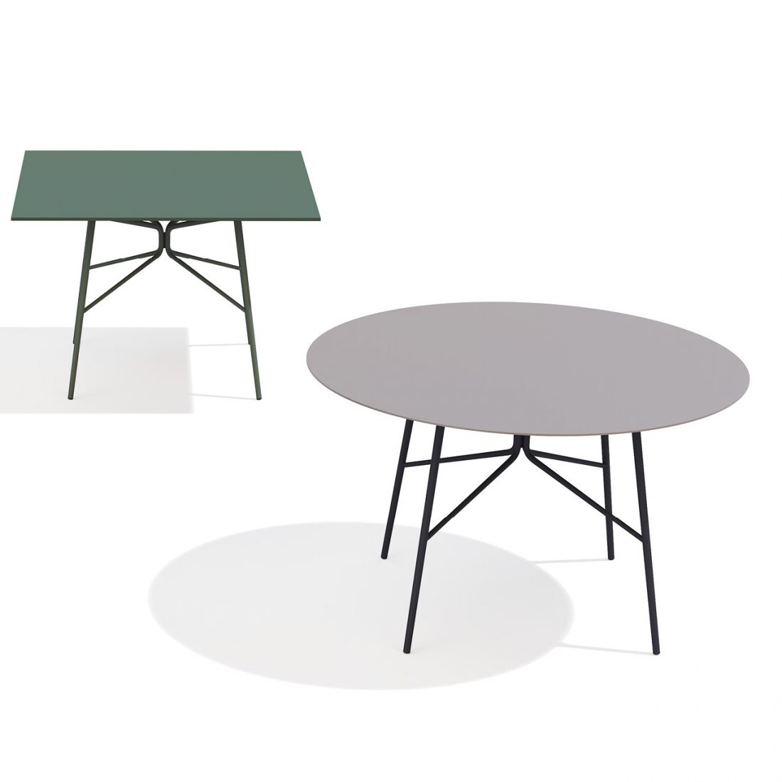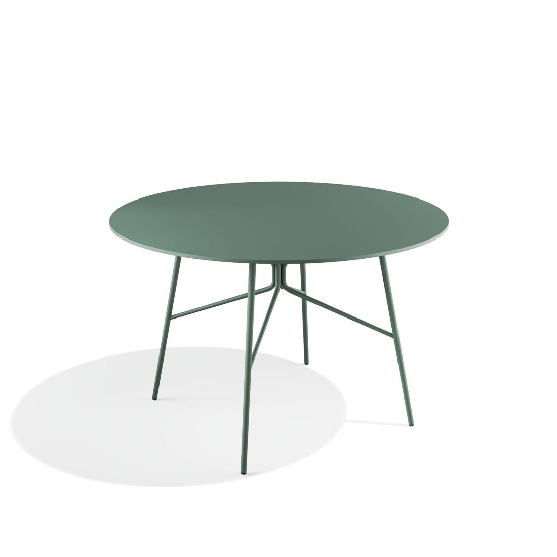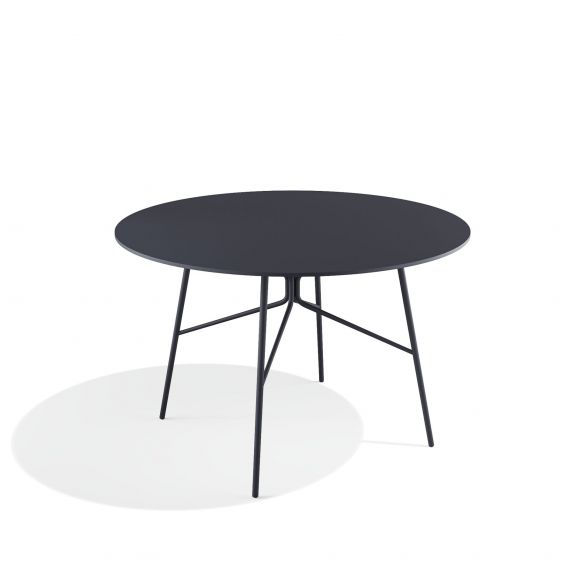 Table ronde Ø120cm avec structure en acieret plateau en acier ou HPL (High Pressure Laminate). Elle possède une structure complexe mais dégage une impression visuelle de légèreté et d’une extraordinaire modernité.