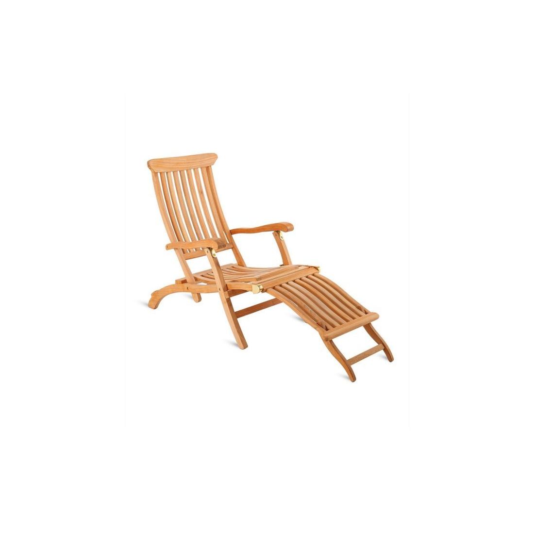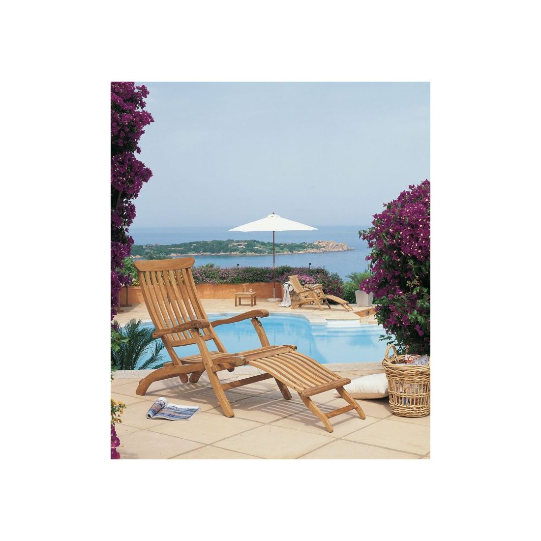 Inspirée des chaises longues des premiers transatlantiques de croisière, la chaise longue Chelsea est pliante, réglable en trois positions et dotée d’un repose-pieds amovible.