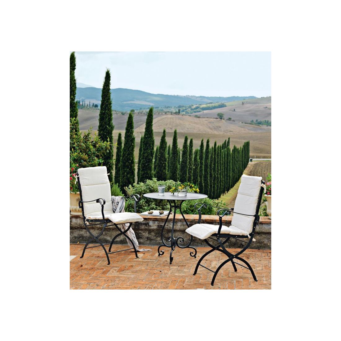 Elle réunit un fauteuil et une chaise réalisés en fer forgé; ils seront garnis de coussins en acrylique couleur Latte.