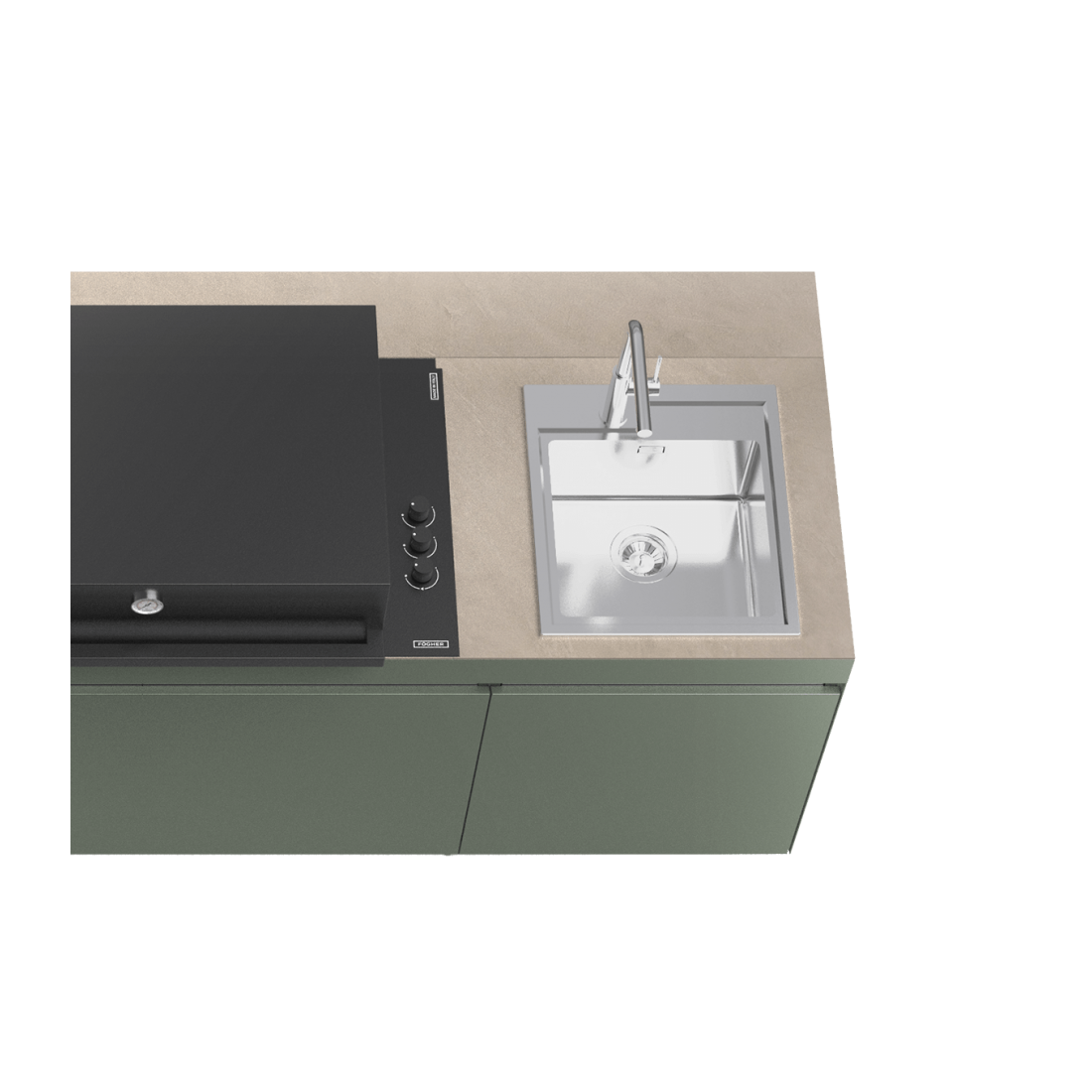 La barre de service de la cuisine Agher est un accessoire polyvalent : elle sert de support supplémentaire ou d'entretoise pour la cuisine lorsqu'elle est placée contre le mur, indispensable pour ouvrir le barbecue dans le modèle FO. Parfaite également comme étagère pour étagères à épices ou verres, elle crée une continuité avec la table lorsqu'elle est disposée linéairement, élargissant ainsi la fonctionnalité de la cuisine.