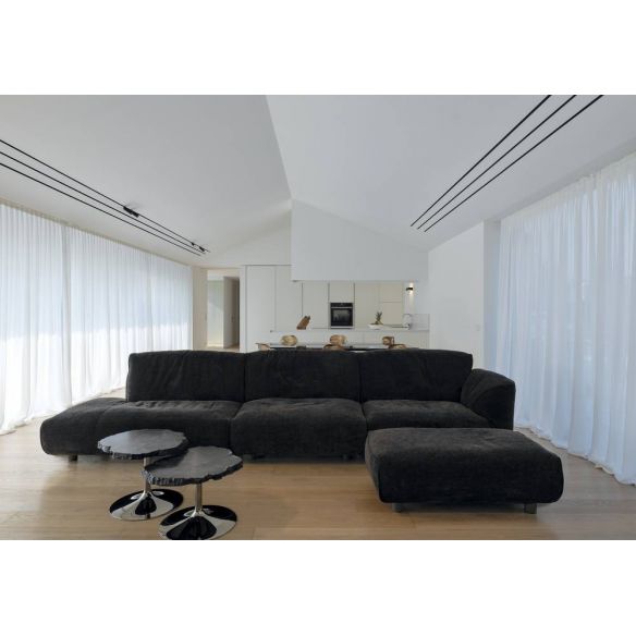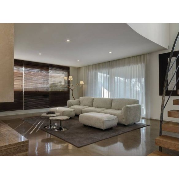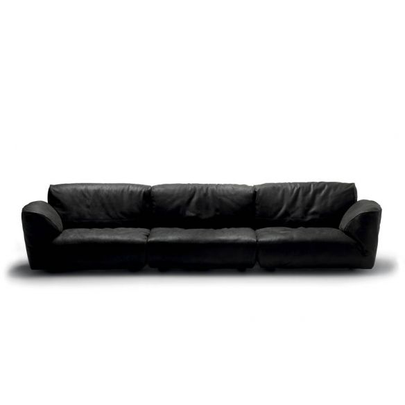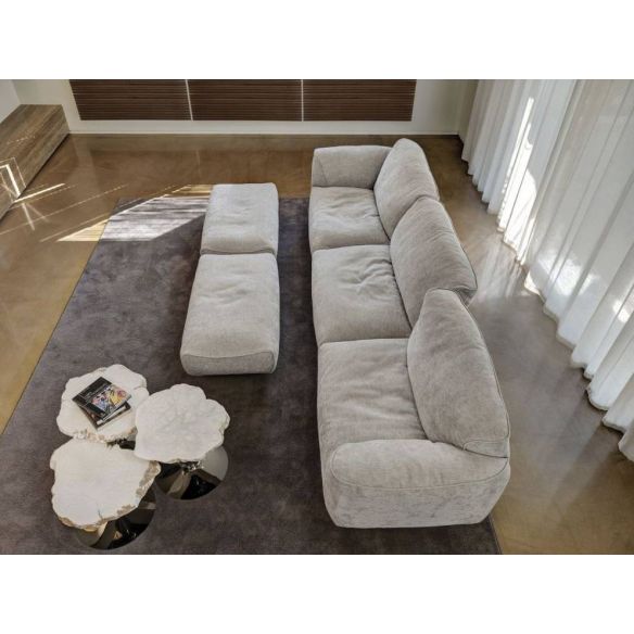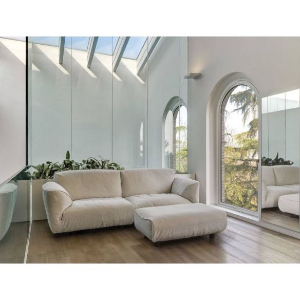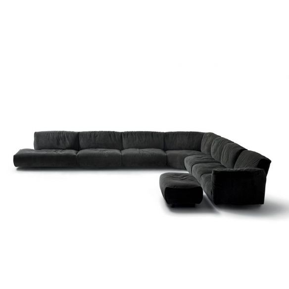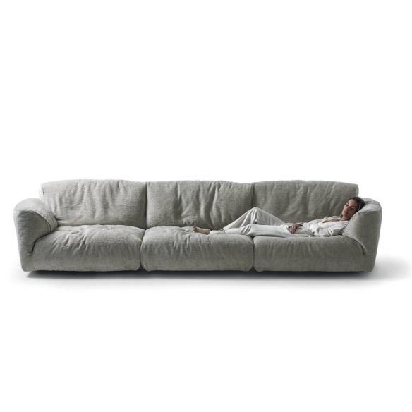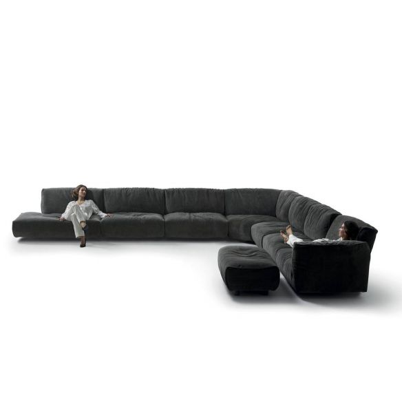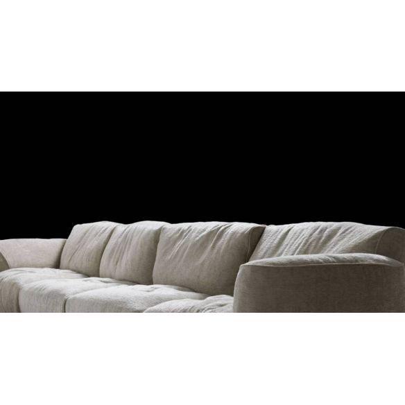 Le rembourrage est en Gellyfoam et une grande quantité de plumes d'oie: le résultat est un confort extrême. Le coussin intelligent permet aux dossiers de s'incliner pour une relaxation maximale. Chaque siège peut accueillir confortablement deux personnes. La modularité permet des compositions linéaires ou angulaires de différentes tailles et formes. Les éléments plus profonds et les poufs complètent la personnalisation offrant une utilisation plus libre du canapé.