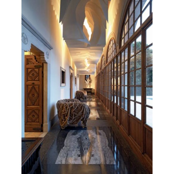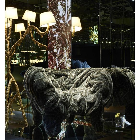 Fauteuil rembourré à dossier bas. Il est fait avec une armature en acier tubulaire recouverte d'un rembourrage et fini en faisant adhérer le rembourrage à celui-ci de manière décontractée, laissée délibérément abondante. La draperie en cuir ou en fourrure douce et écologique rend chaque fauteuil unique.