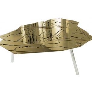 Une mosaïque d'éclats de miroir caractérise cette table avec un plateau irrégulier, disponible en différentes tailles.