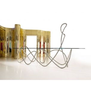 La structure est formée par l'entrelacement de deux systèmes tubulaires métalliques sinueux pliés magistralement avec uniquement des outils manuels qui soutiennent le plateau en verre.