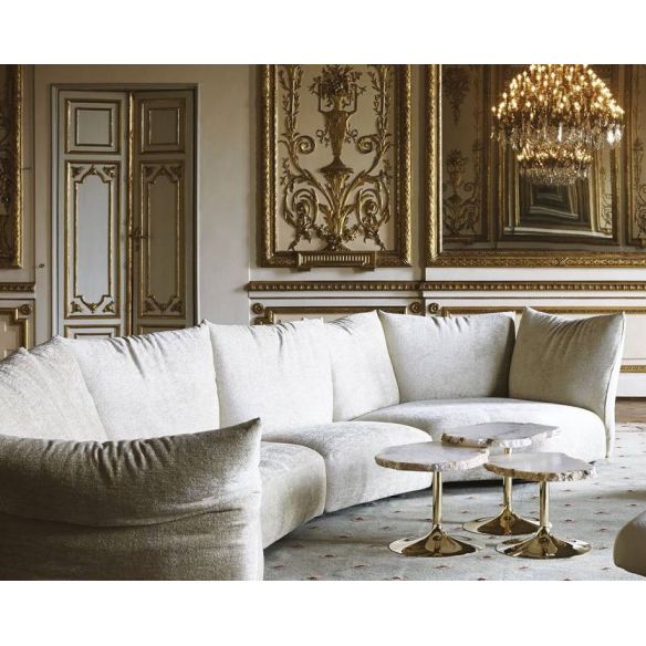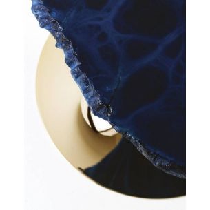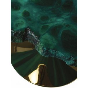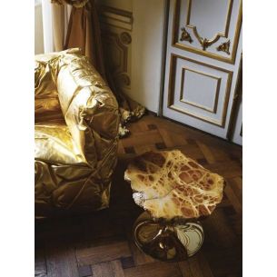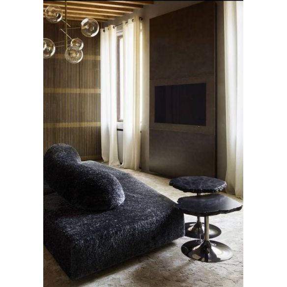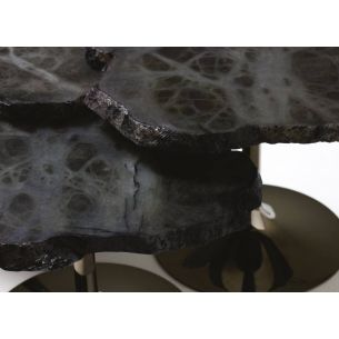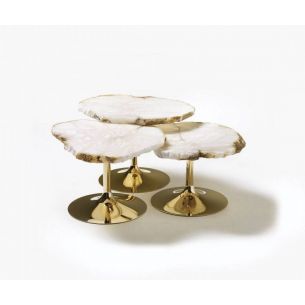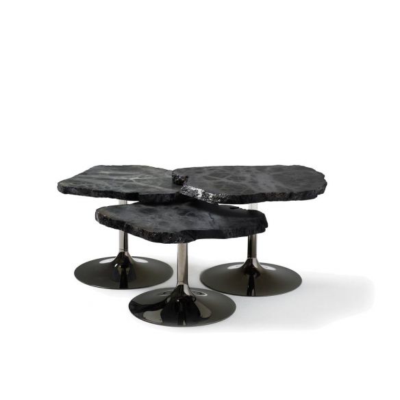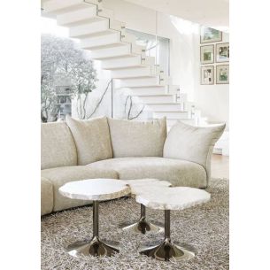 Tables basses avec plateau en albâtre avec un périmètre irrégulier et dentelé, disponibles en différentes hauteurs et couleurs. Les sols sont découpés dans l'ovule brut du minéral évaporitique.