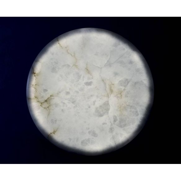 La pierre translucide est soutenue par un piédestal en métal et illuminée rappelle la pleine lune.