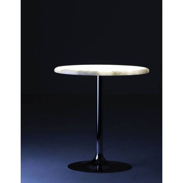 Tables en albâtre, équipées d'un système d'éclairage à batterie rechargeable. Disponible en trois versions: naturel (blanc / gris), ambre, anthracite. La base en métal conique est disponible en trois finitions différentes: or 24 carats, palladium et ruthénium.