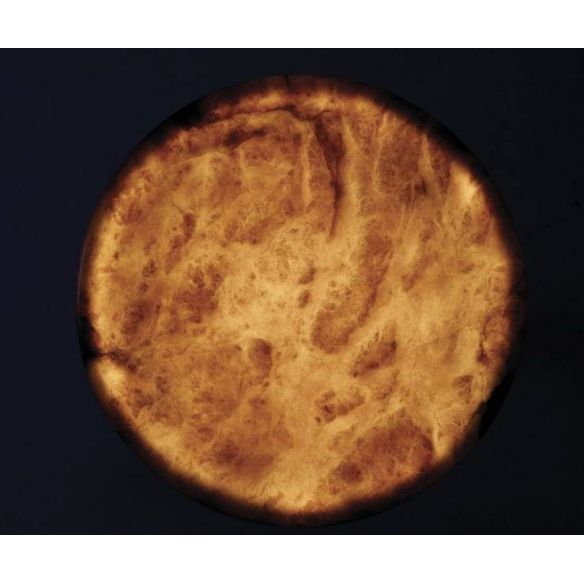 Une table en albâtre obtenue en découpant une section très épaisse dans un ovule de matière pure, éclairé à l'intérieur.