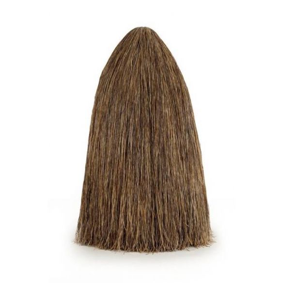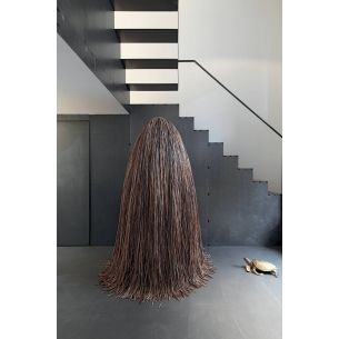 Cinq étagères circulaires de dimensions décroissantes sont dissimulées sous la hutte de très longs fils de raphia viscose, noués à la main pour tomber du haut vers le sol.