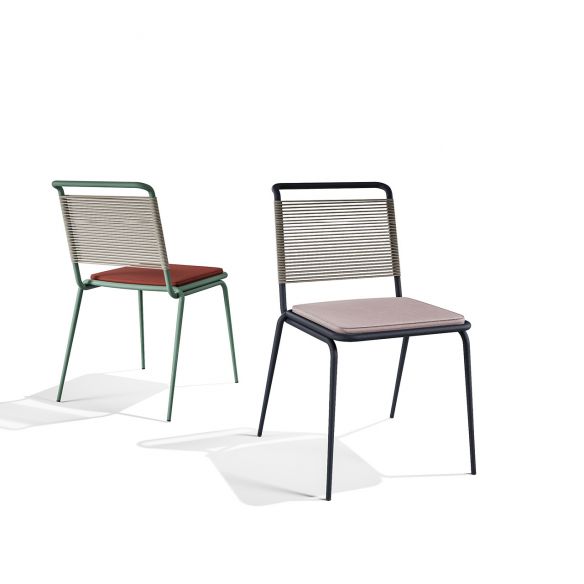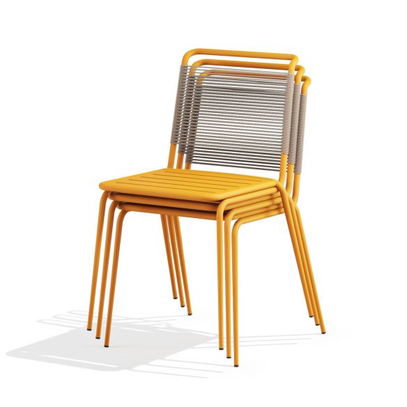Chaise empilable en acier et dossier en corde d’un grand confort. Elle se distingue par ses lignes évoquant l’école du Bauhaus et lui conférant une élégance extraordinaire.