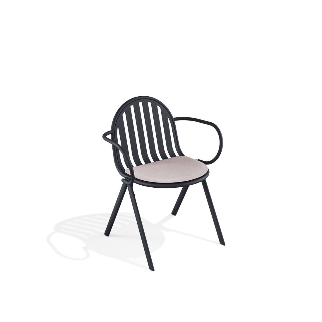 Dining chair empilable en acier aux lignes douces, harmonieuses et sculpturales. Chaque latte est renforcée dans sa partie inférieure par une nervure dissimulée.