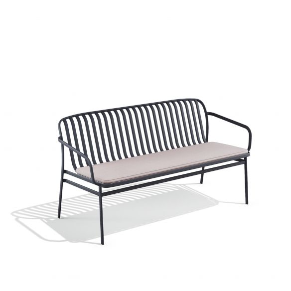 Divan à deux places avec accoudoirs en acier, caractérisé par un motif structurel unique s’étendant sur l’ensemble de l’assise, apportant ainsi force physique et esthétique.