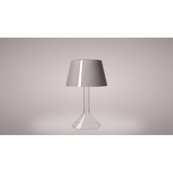 Une lampe de table raffinée dont les éléments de composition ont été réduits au minimum. Un support en verre transparent qui disparaît presque à la vue, un cœur lumineux et un élégant chapeau de verre, sur pied, diffusant une lumière douce et ambiante.