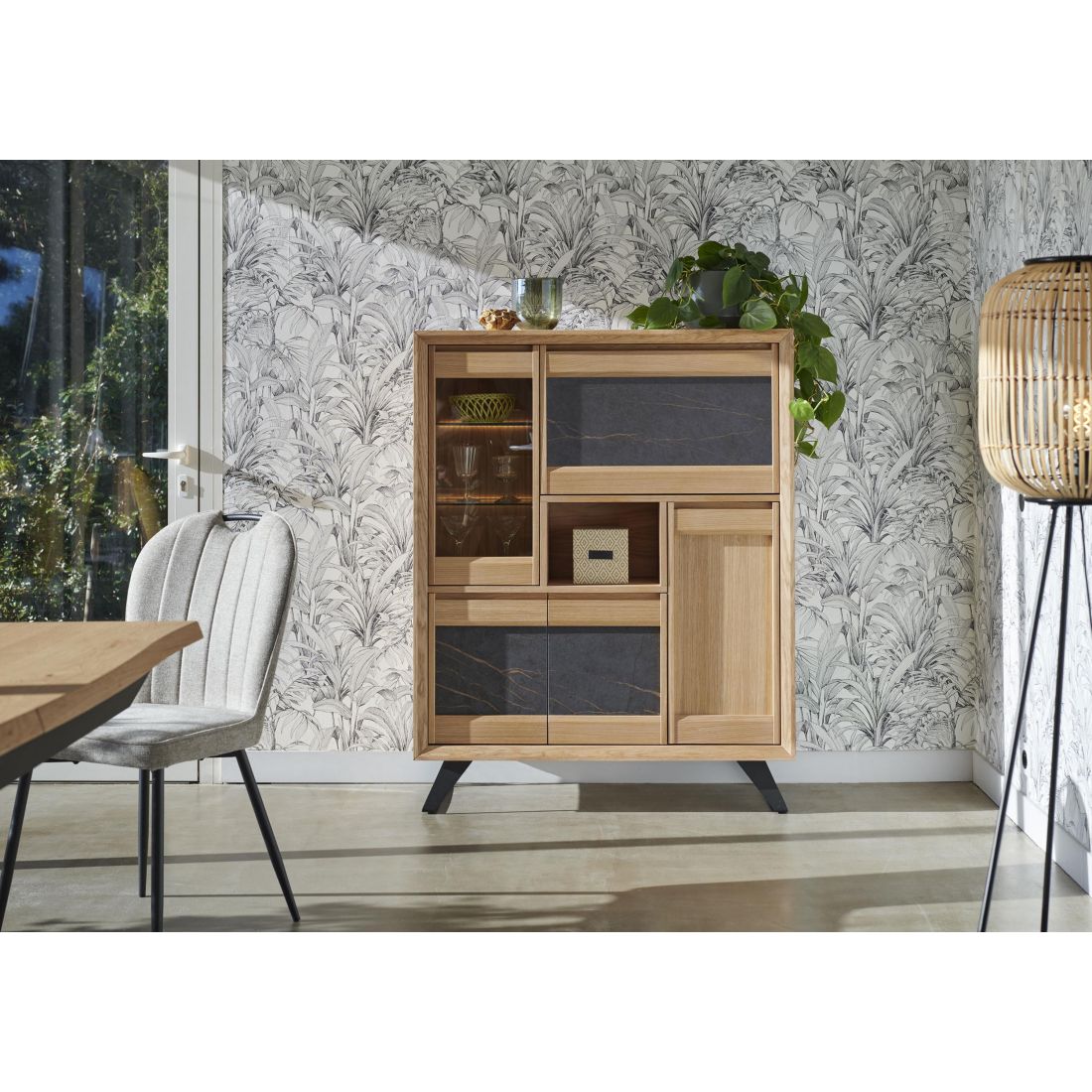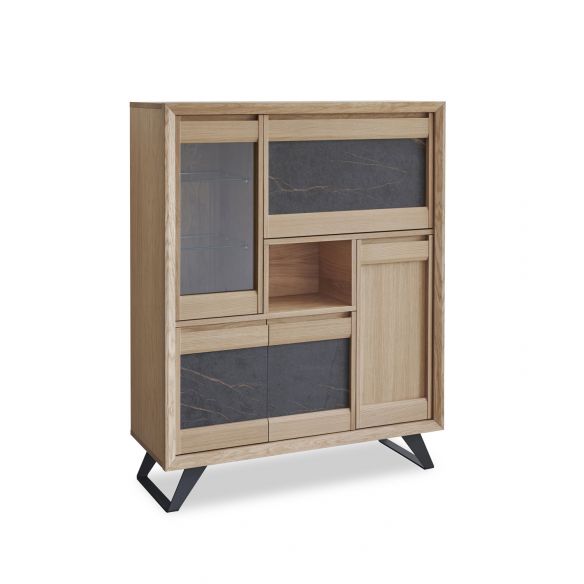 Portes céramique : Panneaux de fibres moyenne densité revêtus de placage chêne et céramique grise veinée (Dekton).