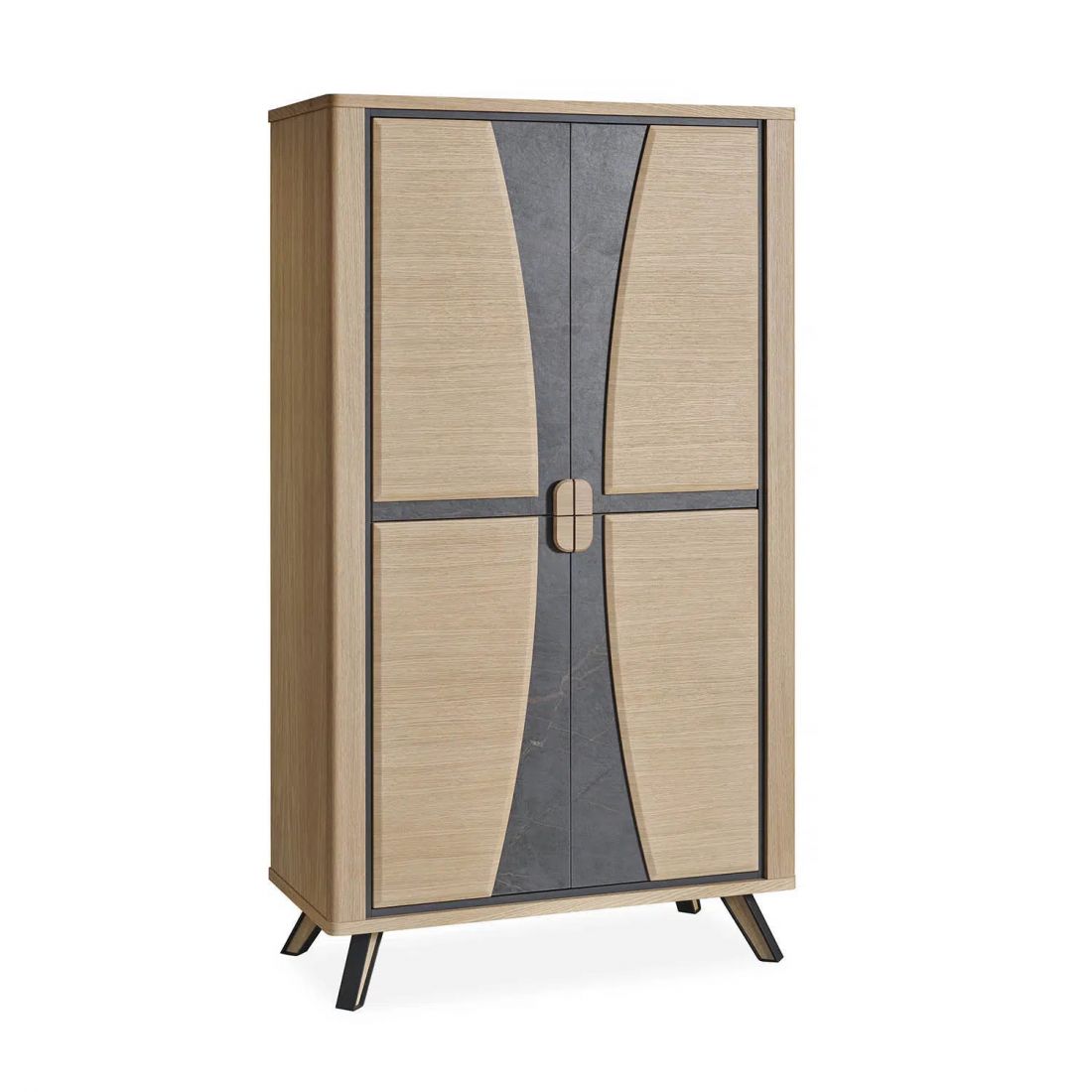 Portes bois : Panneaux de fibres moyenne densité revêtus de placage chêne avec incrustation céramique grise veinée (Dekton).