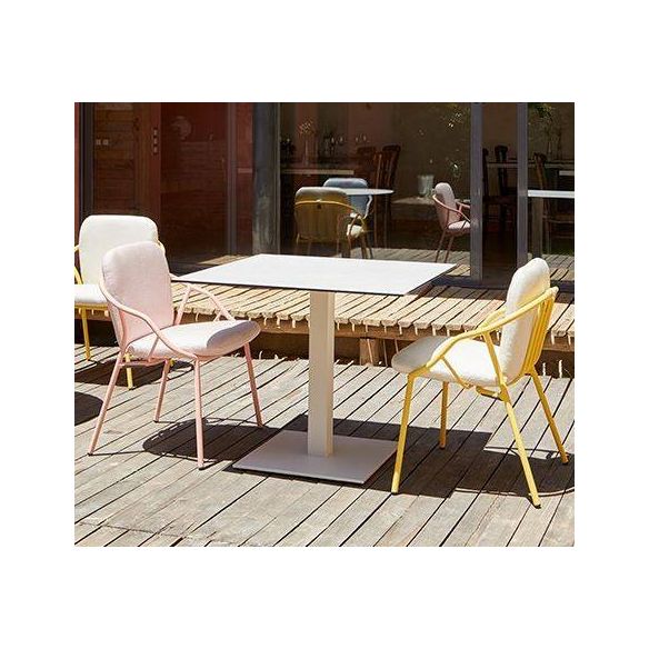 Tables et tables basses avec pied central et plateau céramique laminé sur un support verre disponible en six hauteurs différentes (H33 / H40 / H55 / H75 / H90 / H110). Touts les éléments extérieurs métalliques de sa structure ont été fabriqués en acier inoxydable. Base (45x45,53x53 et 60x40) recouverte d’une tôle de finition.