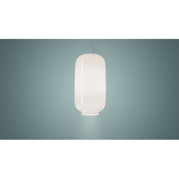 Réinterprétation design des lanternes traditionnelles japonaises, la lampe suspendue Chouchin Bianco 2 diffuse une lumière chaude dans la pièce et dirigée vers le bas. Un anneau inférieur caractérise le diffuseur de forme allongée en verre soufflé.