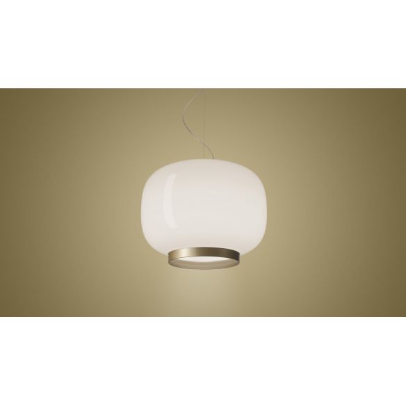 Réinterprétation design des lanternes traditionnelles japonaises, la lampe suspendue Chouchin Reverse 2 diffuse une lumière chaude dans la pièce. Un anneau inférieur coloré complète le diffuseur allongé en verre soufflé blanc. Une lampe qui combine le charme du verre soufflé avec une forme très personnelle.