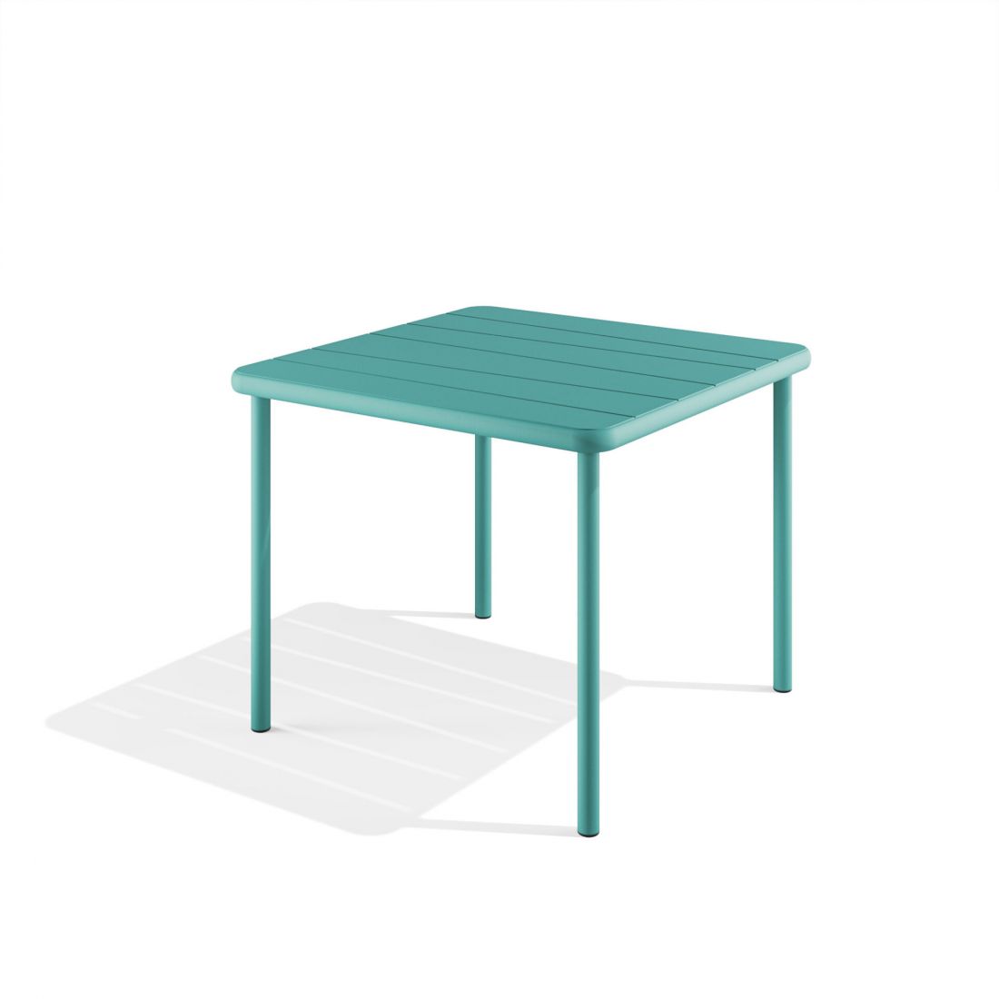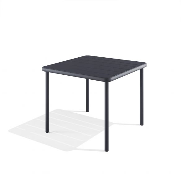 Table carrée 90x90cm en acier avec son plateau à lattes irrégulières, pour une forme inédite. Chaque latte est renforcée par un support invisible qui confère à la table une légèreté insoupçonnée, tant physique que visuelle.
