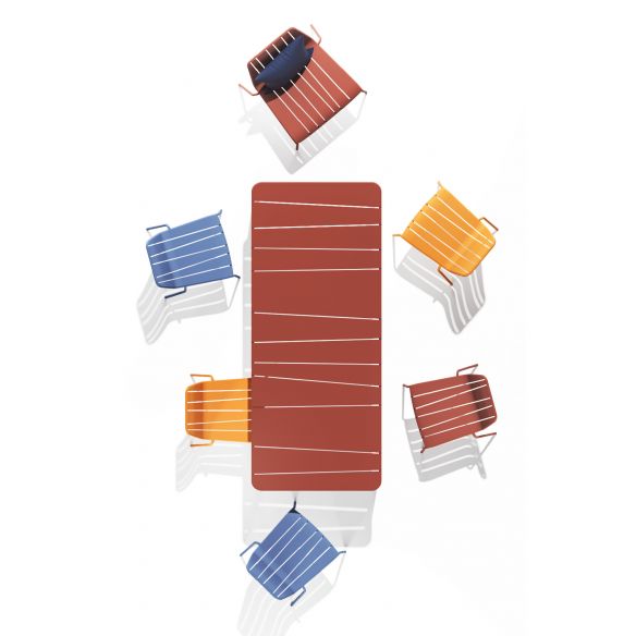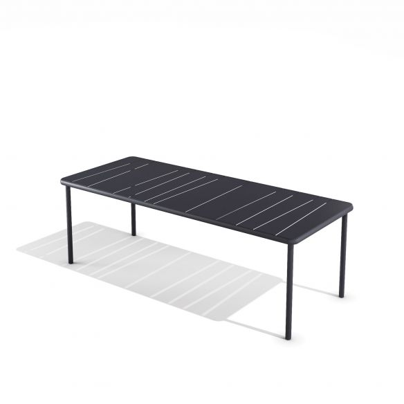 Table rectangulaire 220 x 90 cm en acier avec son plateau à lattes irrégulières, pour une forme inédite. Chaque latte est renforcée par un support invisible qui confère à la table une légèreté insoupçonnée, tant physique que visuelle.